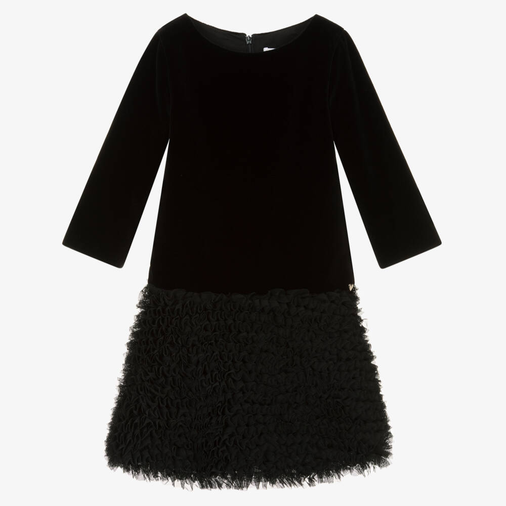 Stunning black special occasion dress for girls by Tartine et Chocolat, luxuriously crafted in super soft velvet. The simple bodice draws attention to the voluminous, gathered tulle skirt hem. It has a concealed zip fastening on the back and shiny gold heart charm sewn near the waist.