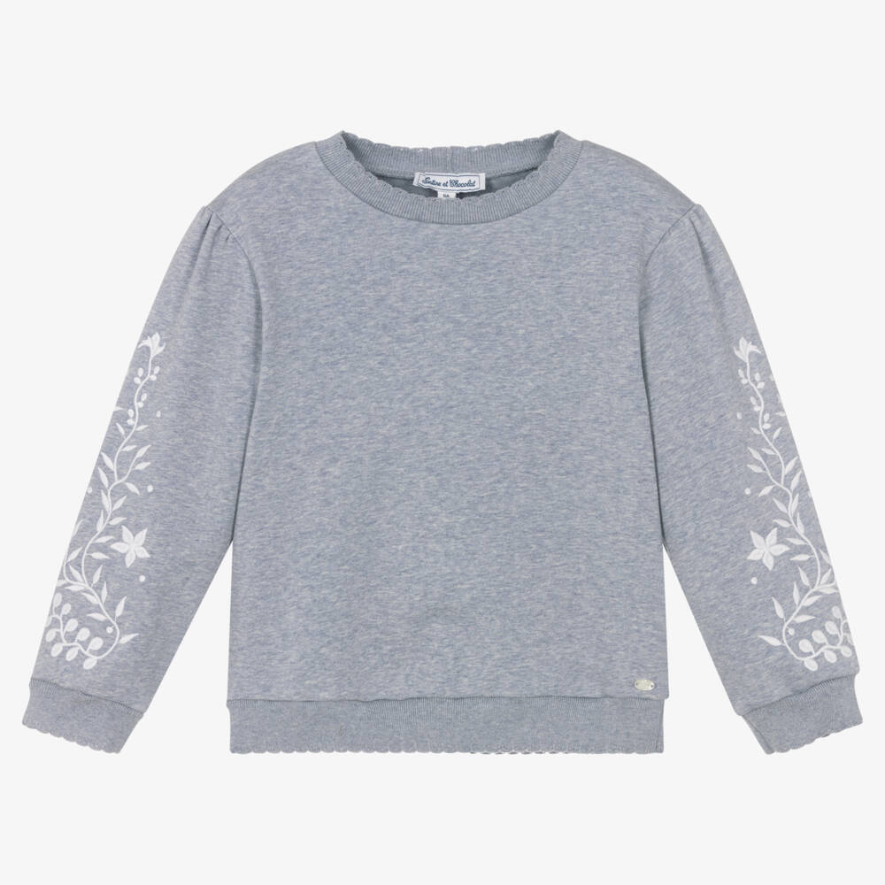 Comfortable blue marl jersey sweatshirt for girls from Tartine et Chocolat. This wardrobe staple is refined with puffed sleeves, dainty scalloped trim on the neckline and hem, along with pretty floral embroidery on the sleeves.
