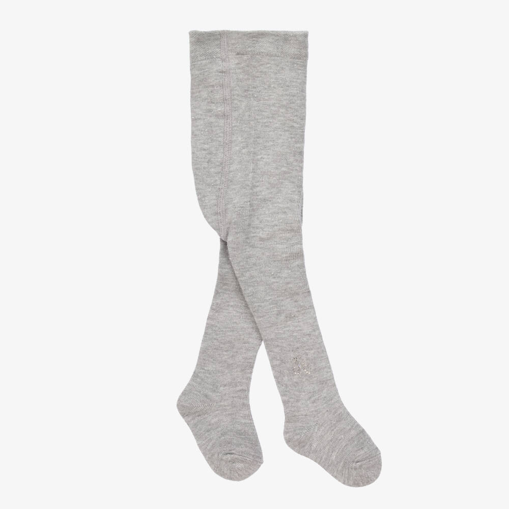 A pair of grey tights for little girls from Tartine et Chocolat, with sparkling silver thread within the knit. So soft and stretchy in a viscose blend, they have an elasticated waist for comfort and a silver diamanté-studded monogram logo on the ankle.