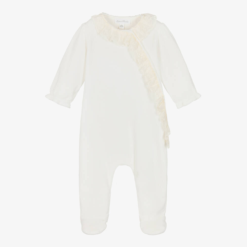 Ivory cotton babygrow by traditional French brand Tartine et Chocolat. It is made in super soft velour, with a beautiful, ivory, floral lace collar and front ruffle. The pretty puffed sleeves have frilled cuffs, gently elasticated for comfort, whilst the soles of the feet are embroidered with logos. There are easy-to-use poppers on the front and between the legs for speedy dressing.