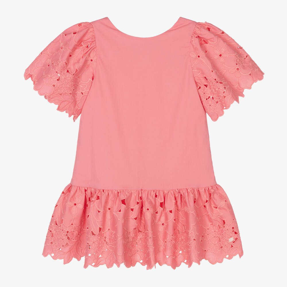A short-sleeved dress for girls by Tartine et Chocolat, in a lovely shade of pink. Ideal for smart occasions or warmer evenings, this pretty dress is made in a light cotton blend with a beautifully soft lining. There are embroidered, cutwork florals on the sleeves and identical detailing used on the hem for a refined finishing touch. The dress has a simple round neckline and a concealed zip fastening on the back.