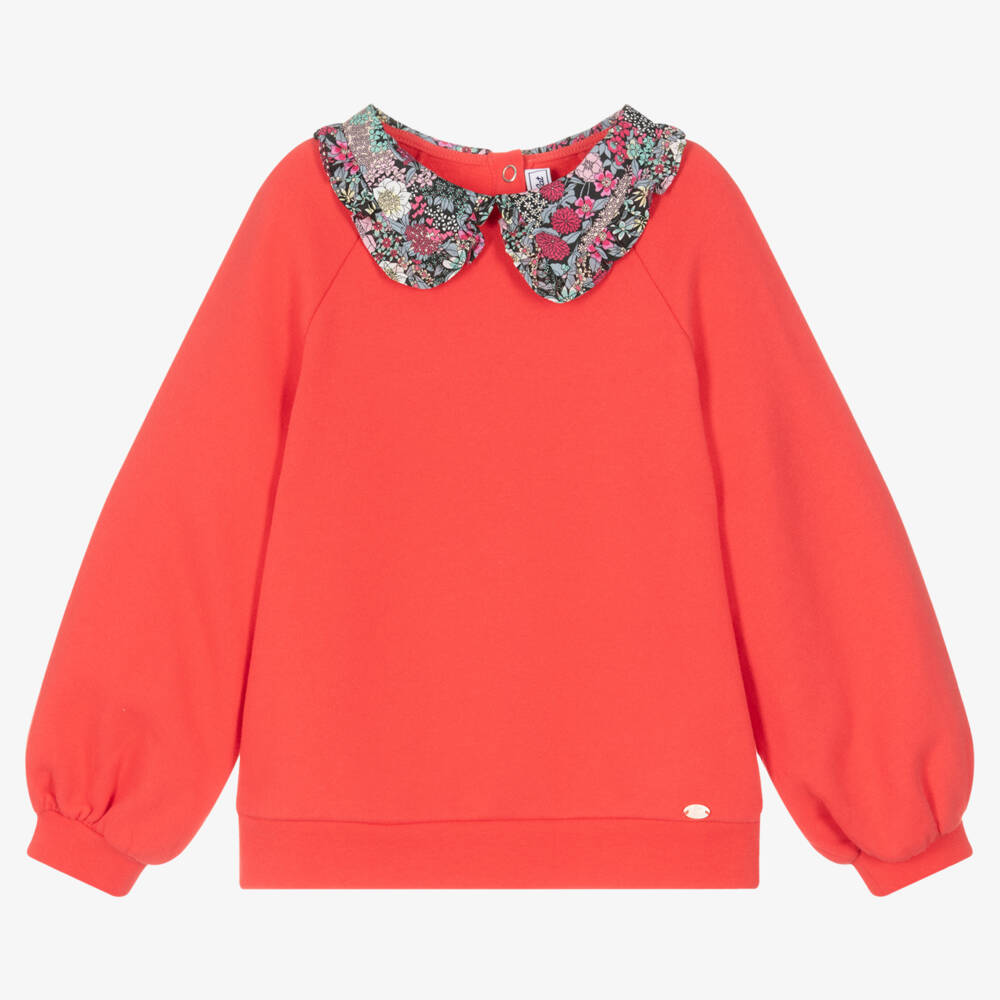 Pink sweatshirt for girls by French designer Tartine et Chocolat. Made in soft cotton jersey for effortless comfort, it has a pretty floral collar in a Liberty print for a layered look, and balloon sleeves. It fastens easily with poppers on the back and has a sweet ivory charm sewn near the front hem.