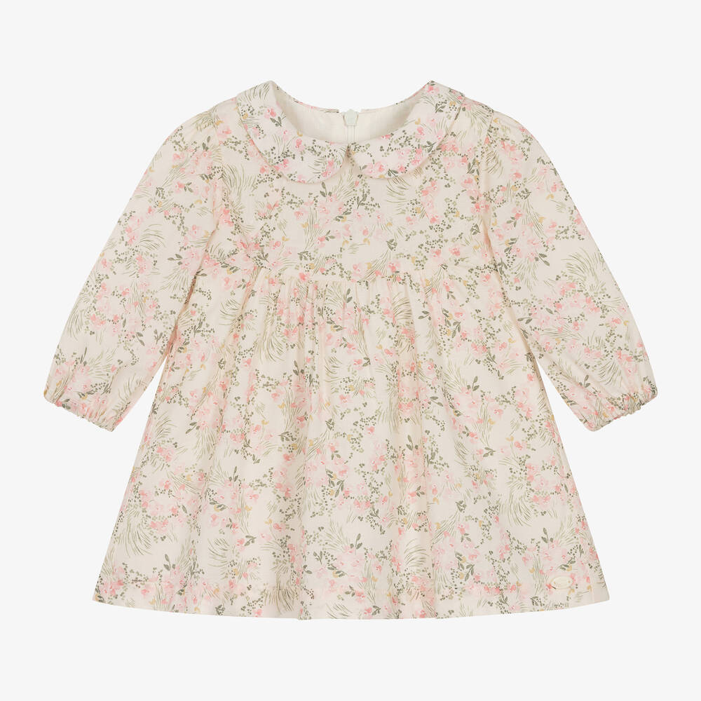 A light pink floral dress for little girls by Tartine et Chocolat, made and lined in gentle-on-the-skin cotton voile. Designed in a timeless and elegant style, this collared dress has a wildflower pattern in muted pinks and greens. The long sleeves have elasticated cuffs and gather on the shoulders for a slight puff effect. It has a discreet logo charm above the hem and a neat, hidden zip on the back.
