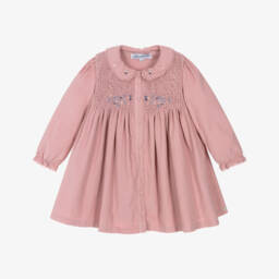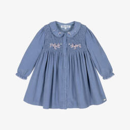 In a lovely shade of pink, this sweet needlecord dress for little girls is designed by Tartine et Chocolat. Beautifully soft, this classic piece is styled with a lace-trimmed collar and gently ruched bodice with delicate blue floral hand embroidery. It is lined for comfort and fastens neatly with buttons on the front.