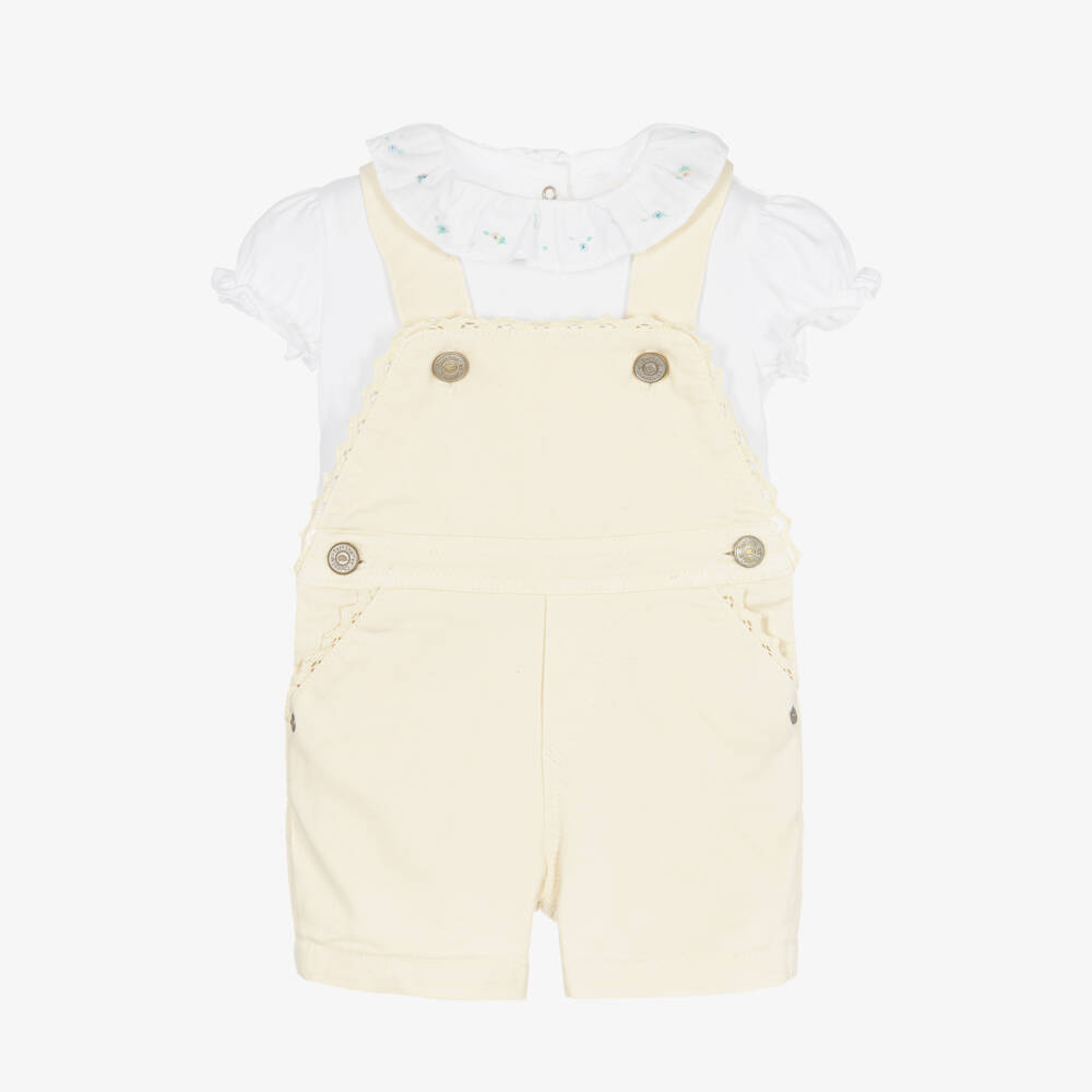 Pretty pale primrose yellow dungarees set for little girls by traditional French brand Tartine et Chocolat, just right for casual days. The white bodysuit is made in comfortable cotton jersey with a voile collar, embroidered with yellow and turquoise blue flowers. It has feminine puffed sleeves with gently elasticated, frilled cuffs. Fastening with easy-to-use poppers on the back and between the legs, it always looks neat and never becomes untucked. The pale yellow dungarees are made in cotton twill with lace trims. They have the brand's logo embroidered on the back pockets and fasten with silver logo buttons on the shoulder straps and sides. There are popper fastenings between the legs.