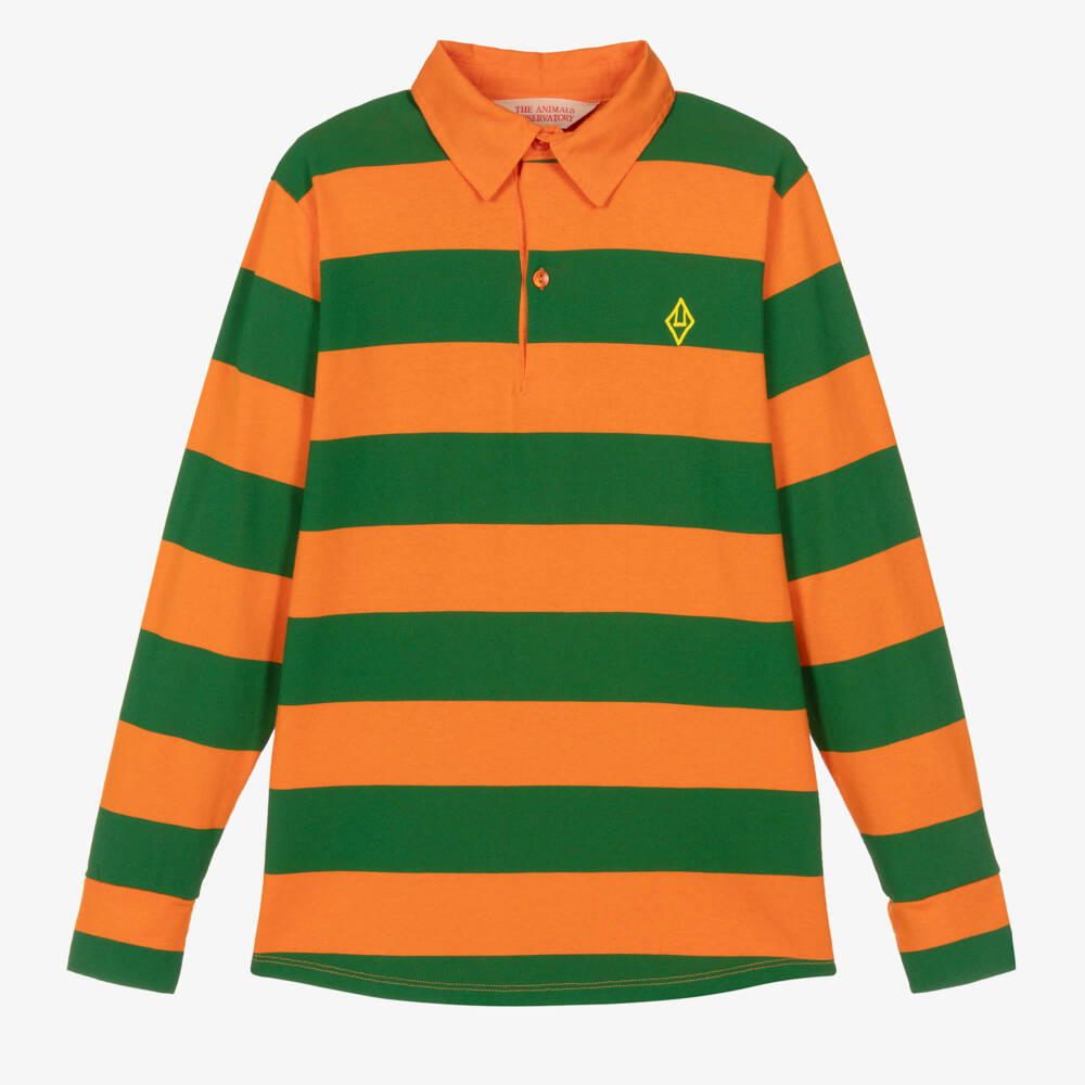 A green and orange rugby shirt for teen boys from The Animals Observatory, embroidered with a signature bright yellow logo. In a bold stripe design, this jersey top has a distinctive yellow logo printed on the back for cool, sporty styling. It is complete with a classic pointed collar and has button fastenings beneath.