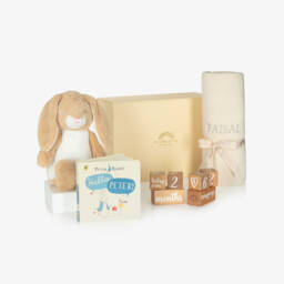 طقم هدايا لطيف من ماركة ذا بيبي جيفتينغ كومباني للأولاد الرضع، مُنسّق بعناية للاحتفال بوصول المولود الجديد. يجمع بين الدفء والقصص الجميلة مع بطانية زرقاء محبوكة فائقة النعومة يمكن تخصيصها باسم الطفل، وكتاب بيتر رابيت يرافقه أرنب طرّي يجسّد عالم بياتريكس بوتر المحبوب. ويشمل الطقم أيضًا مجموعة مكعبات خشبية لتوثيق مراحل نمو الطفل وتسجيل لحظاتهم الثمينة.