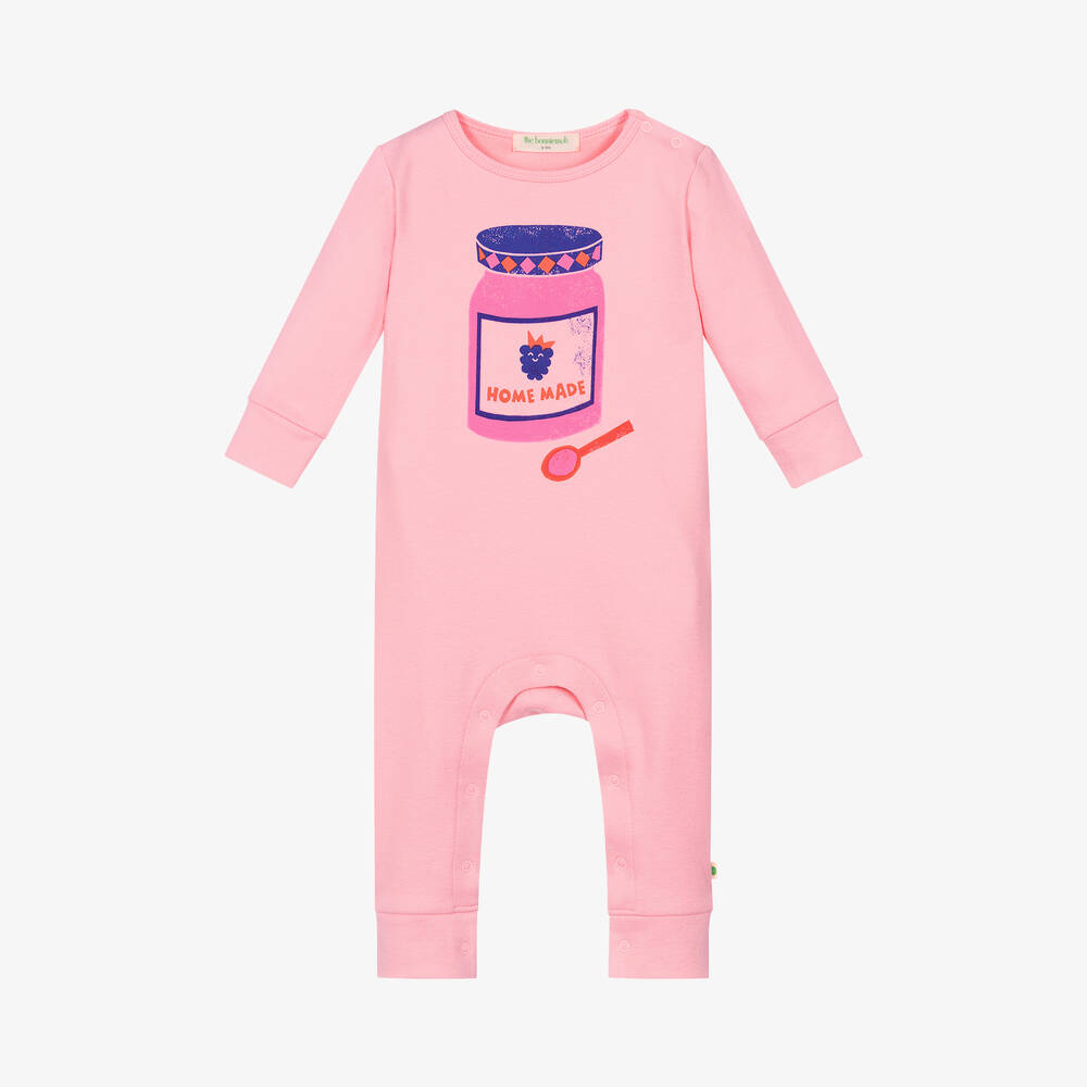 Pink romper for baby girls by the bonniemob, made in soft and comfortable organic cotton jersey. Gentle against delicate skin, this lovely babysuit has a fun jam jar print. There are easy popper fastenings on one shoulder and between the legs.