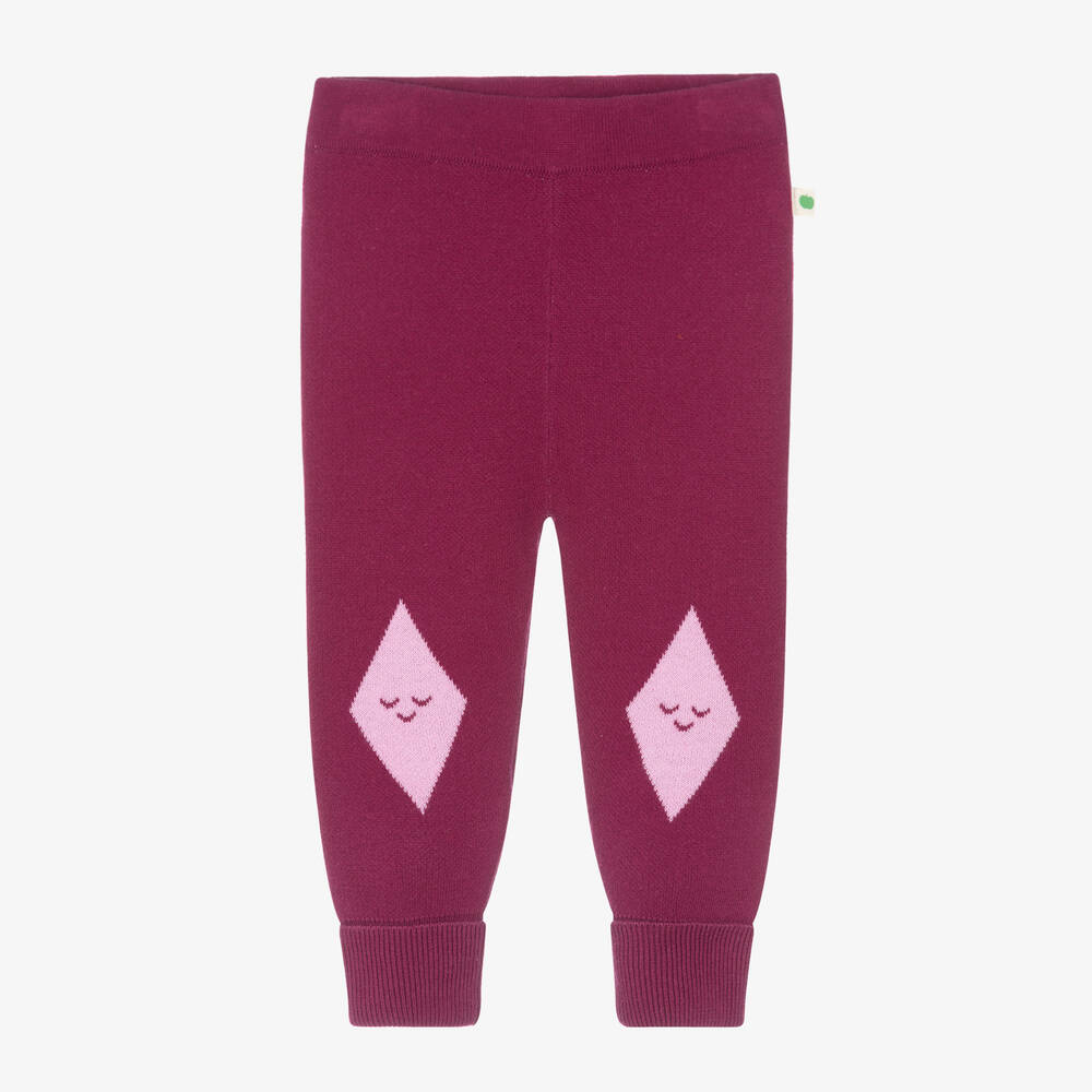 Beautifully soft and comfortable knitted trousers for baby girls by the bonniemob, in a lovely magenta purple shade. A casual, jogger-style fit, they are knitted in organic cotton with an adjustable, stretchy waistband and ribbed, turn-up cuffs. A smiling diamond on the knees adds a fun touch and the British brand's logo tab can be seen on the side seam.