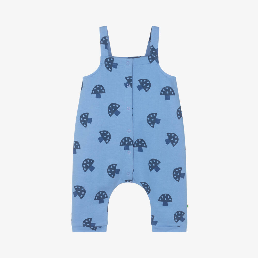 Lovely blue dungarees for baby boys and girls by the bonniemob, patterned with navy blue mushrooms. This ideal layering style is made in comfortable organic cotton jersey with a soft brushed feel inside and fastens with easy-to-use poppers on the front. The British brand's signature apple logo tab is stitched on the side seam to complete the look.