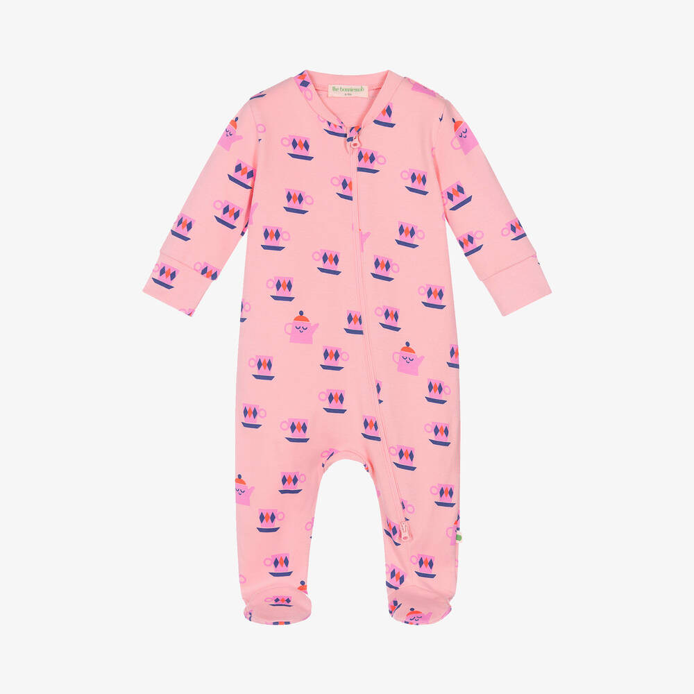 Beautifully soft and gentle for delicate skin, this pink the bonniemob babygrow for girls is made in comfortable organic cotton jersey. It has a sweet teacup and teapot print and fastens with a useful two-way zip that has a protective chin guard. For a discreet designer finish, the British brand's apple logo tab can be seen on the side seam.