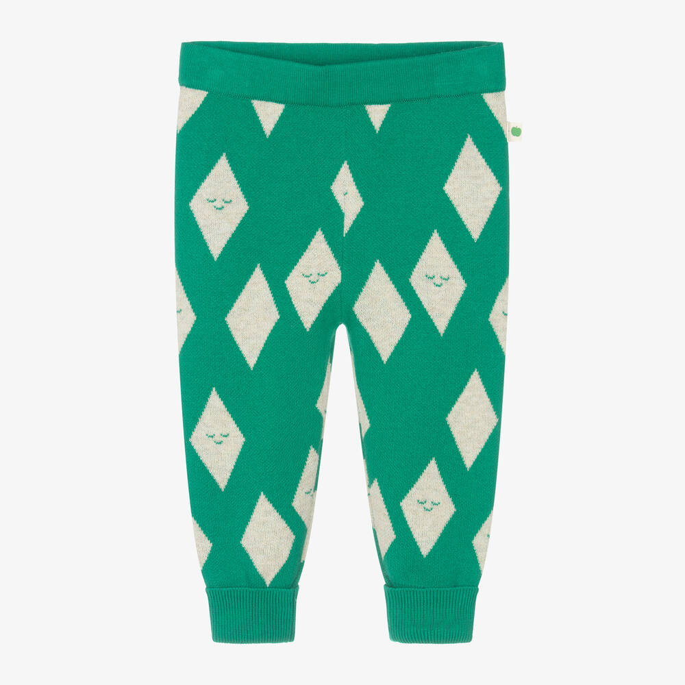Green joggers for baby boys and girls by British brand the bonniemob, knitted in soft organic cotton. Gentle against delicate skin, they have a fun ivory diamond pattern with cute smiling faces. They have cosy ribbed trims with turned-up cuffs and a useful adjustable waistband. The designer's signature apple logo tab is on one side.