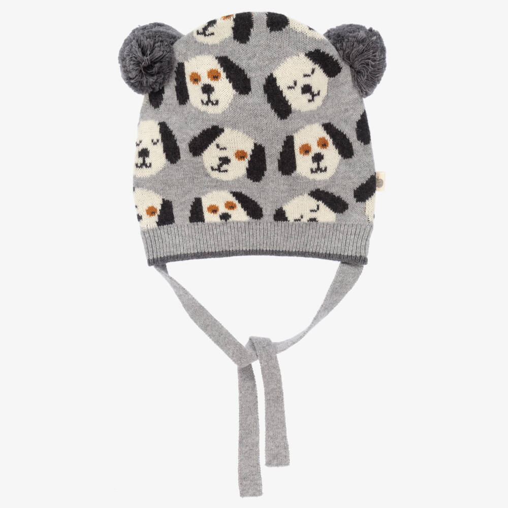 Grey knitted hat for baby boys and girls, by The Bonnie Mob. Made from a lovely blend of organic cotton and cashmere, it has a cute jacquard dog motif with gorgeous grey pom-poms.