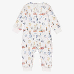 Grey romper for baby boys and girls by The Little Tailor, made from soft cotton jersey for a gentle feel on the skin. Both cute and practical, this one-piece is patterned with white hares and finished with ribbed knit trims on the neckline and cuffs. The full zip front, allowing for easy nappy changes, has a protective zip guard under the chin for added comfort. The design also ensures little ones can have their feet free so they can wear shoes or practise crawling.