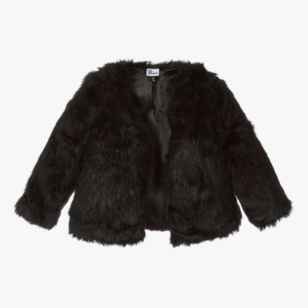 A fun black jacket for girls by Swedish brand The Tiny Universe, made in soft faux fur. Stylish and comfortable, this fluffy style has a silky satin lining and an open front. A tonal logo patch can be seen on the back of the neckline.