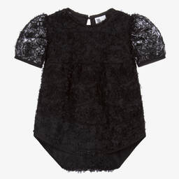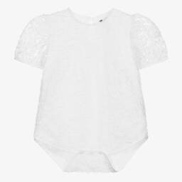 Little girls stylish white bodysuit by The Tiny Universe. It is made in comfortable jersey with a soft tulle overlay, scattered with georgette flower appliqués. It has cute puffed sleeves and a white logo tab on the back. There are useful poppers between the legs, so when worn as a blouse it never becomes untucked.