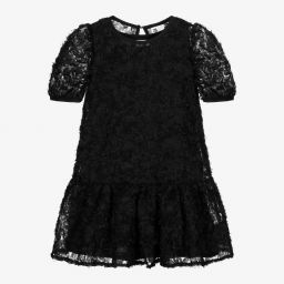 White tulle lace dress for girls by The Tiny Universe. It is covered with delicate fabric flowers and has a separate silky, soft jersey lining. The sleeves are see-through and the dress fastens with a single button on the back.