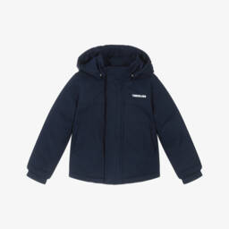 Black jacket for boys by Timberland, made in durable fabric with a water repellent finish. Warmly padded with a quilted satin lining, it has a detachable hood, practical pockets and ribbed cuffs. The front zip fastening is concealed beneath a popper placket, and a white logo print on the chest adds a distinctive designer touch.