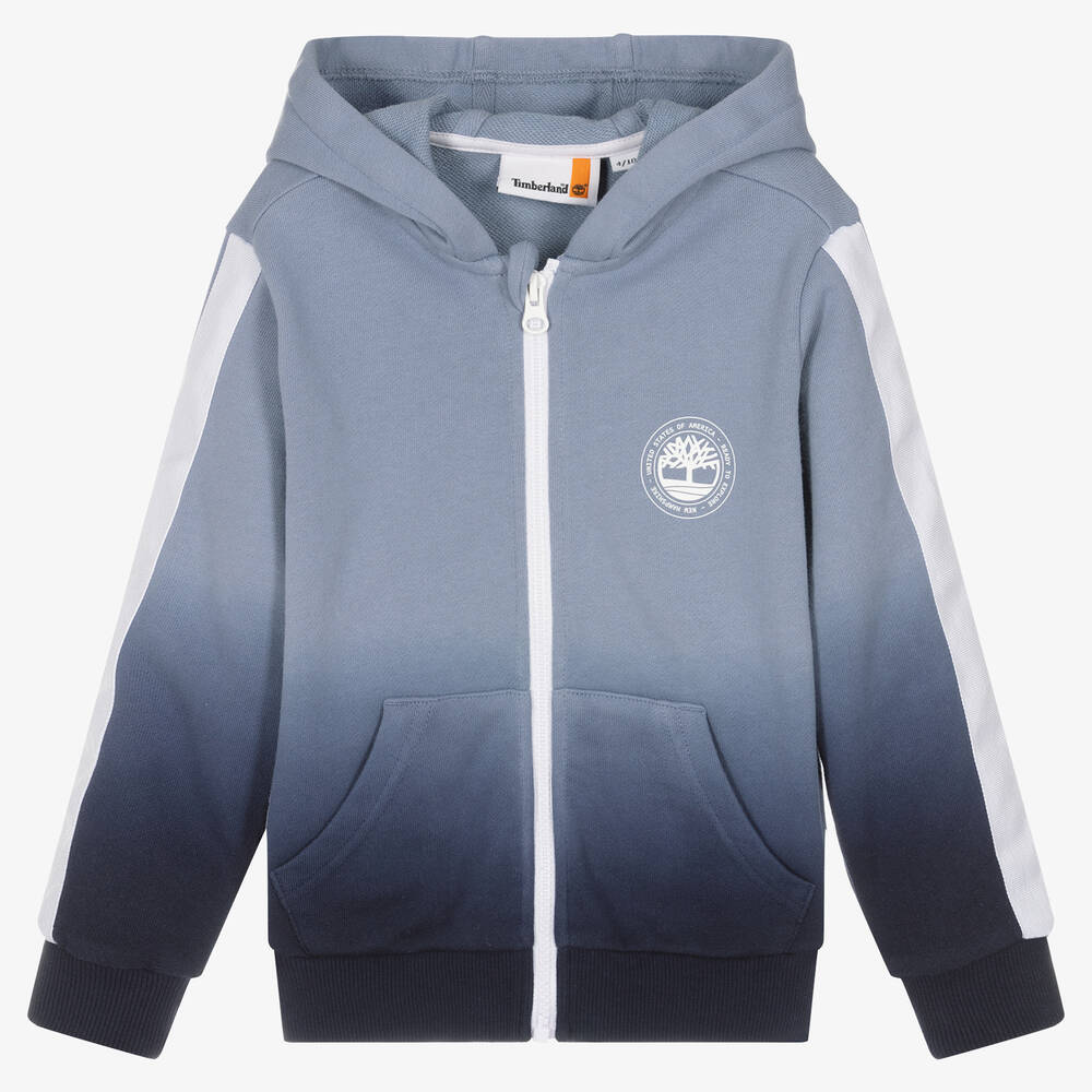 A dusky blue ombré-effect hoodie for boys, by Timberland. In a functional zip-up style, this cotton jersey top has front pockets and ribbed trims for comfort. There are white grosgrain tapes down the sleeves and the brand's signature tree logo is printed on the chest.