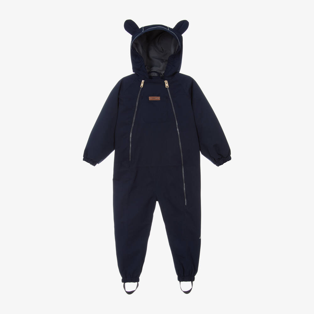 In plain navy blue, this zip-fastening puddlesuit for boys and girls is by Töastie. The soft shell is made from recycled plastic bottles, with waterproof taped seams and a lightweight breathable airtex lining. There are subtle reflective details for added safety, with elasticated adjustable stirrups and cuffs. It has a front pocket and comes with a matching zipped pouch for easy packability.