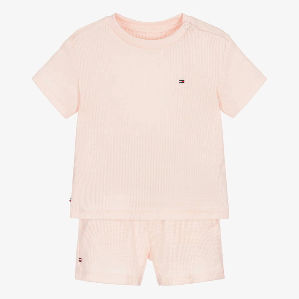 Lovely and casual, pale pink T-shirt and shorts set for baby girls by Tommy Hilfiger. This comfy outfit is made in stretchy and comfortable, waffle-textured cotton jersey with the iconic flag logo embroidered on both pieces. The crew neck top fastens with poppers on one shoulder. The pull-on shorts have an elasticated drawstring waist, two side seam pockets and one on the back.