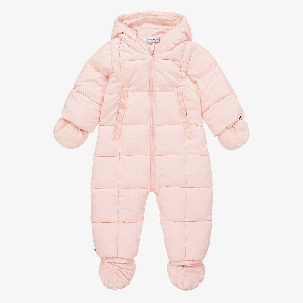 Pink hooded snowsuit for baby girls from Tommy Hilfiger, with detachable mittens and booties. Silky smooth and eco-friendly, this quilted style is made and warmly padded with recycled fibres. It has an easy long zip fastening with a protective chin guard and the popper-fastened, fleece-lined pockets have logo jacquard trim. The American brand's flag logo is embroidered on one sleeve for a signature finish. The outer fabric and padding are made with at least 95% recycled polyester.