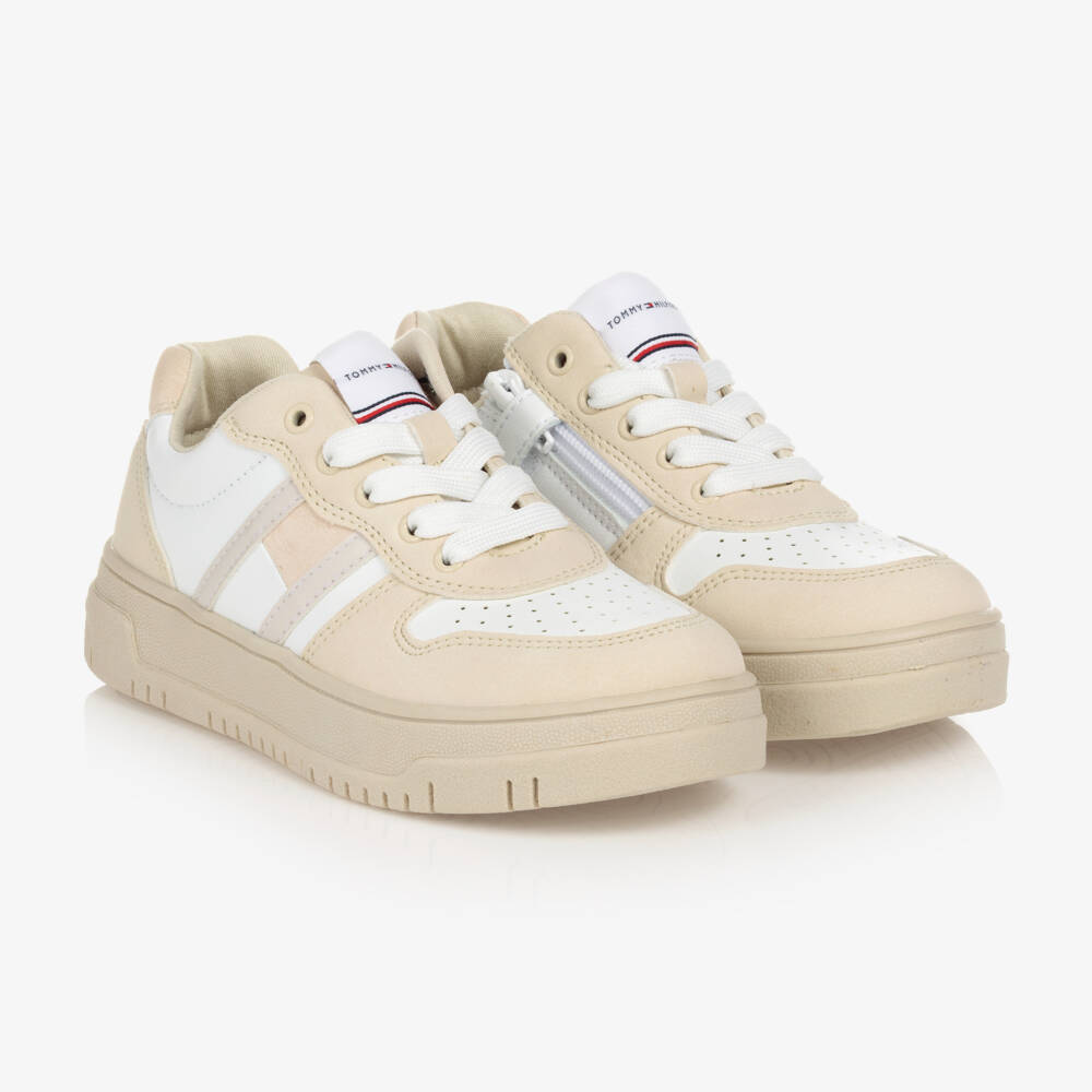 Beige and white trainers for boys and girls by Tommy Hilfiger. This fun retro style is made in soft faux leather, showcasing the designer's flag logo appliqué on the side and one printed on the heel, with further branding throughout. They are lined in soft canvas with a lightly padded insole and ankle for comfort. The chunky rubber outsole is ridged to allow better grips. Practical and easy to wear, there is a side zip fastening in addition to the laces. The polyester in this product is at least 50% recycled.