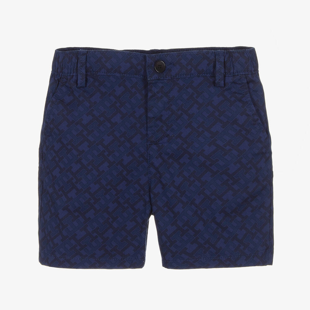 Smart casual navy blue cotton shorts for boys by Tommy Hilfiger, patterned with an all-over TH monogram logo print. In a straight fit, they are styled with slanted front pockets and two buttoned back pockets, one is embroidered with the flag logo for the designer's signature look. They fasten with a zip and button on the adjustable waist.