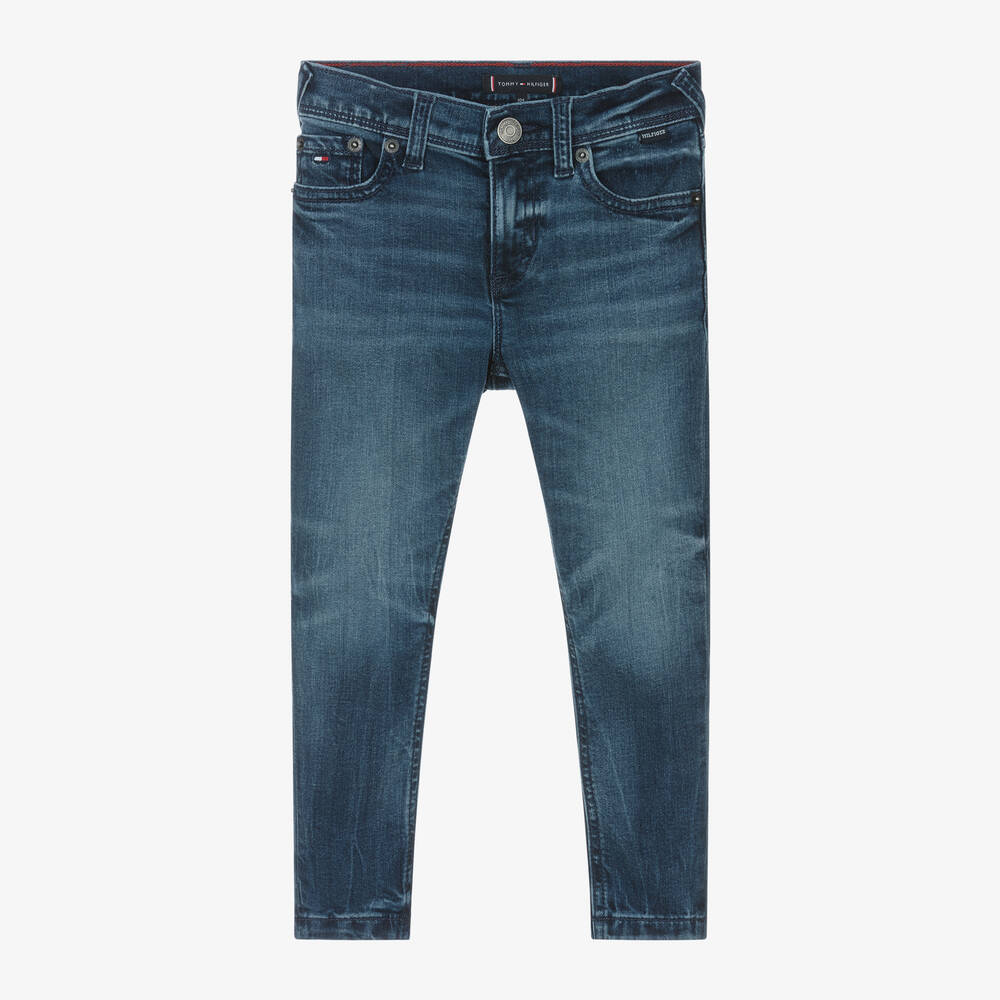 Blue jeans for boys by Tommy Hilfiger, made in soft stretch denim. With a stylish washed and worn look, these slim-fitting jeans have an adjustable waist and a simple fastening on the front. A tan brown logo patch and embroidered tricolour flag details add a branded touch. This item is made using at least 20% recycled cotton.