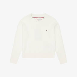 Navy blue sweater for boys by Tommy Hilfiger, knitted in a soft cotton blend. Varsity-inspired, this crew neck style has an intarsia white logo across the chest for a branded look. Khaki green stripes can be found on the sleeves for a sporty vibe. The iconic tricolour flag logo is embroidered on one cuff for a subtle designer finish. This item is made using at least 50% organic cotton.