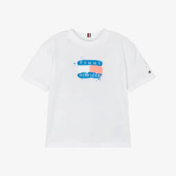 White cotton jersey T‑shirt for boys by Tommy Hilfiger, with a graffiti‑style flag logo across the front. Comfortable to wear, it's one that pairs easily with his everyday outfits.