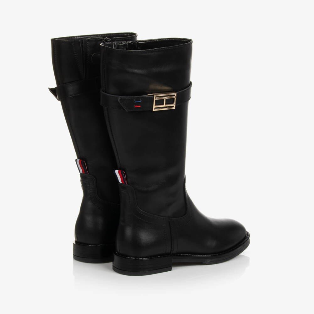 Black long boots for girls by Tommy Hilfiger, made in beautifully soft leather. Comfortable to wear they fasten on the side with a zip, secured with a velcro tab. They have a soft textile lining and a lightly padded insole, with a non-slip rubber outer sole and small heel. There is a fixed strap trim with a gold-tone logo buckle and blue and red logo embroidery. A logo-branded tab is on the back of the ankle for extra designer appeal.
