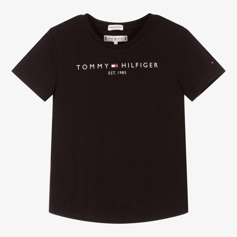 Girls black T-shirt from Tommy Hilfiger, made in lightweight organic cotton jersey. It has a white logo print on the chest and an embroidered flag logo in white, red and blue on the sleeve. A comfortable, casual top with capped sleeves and a shaped hemline.
