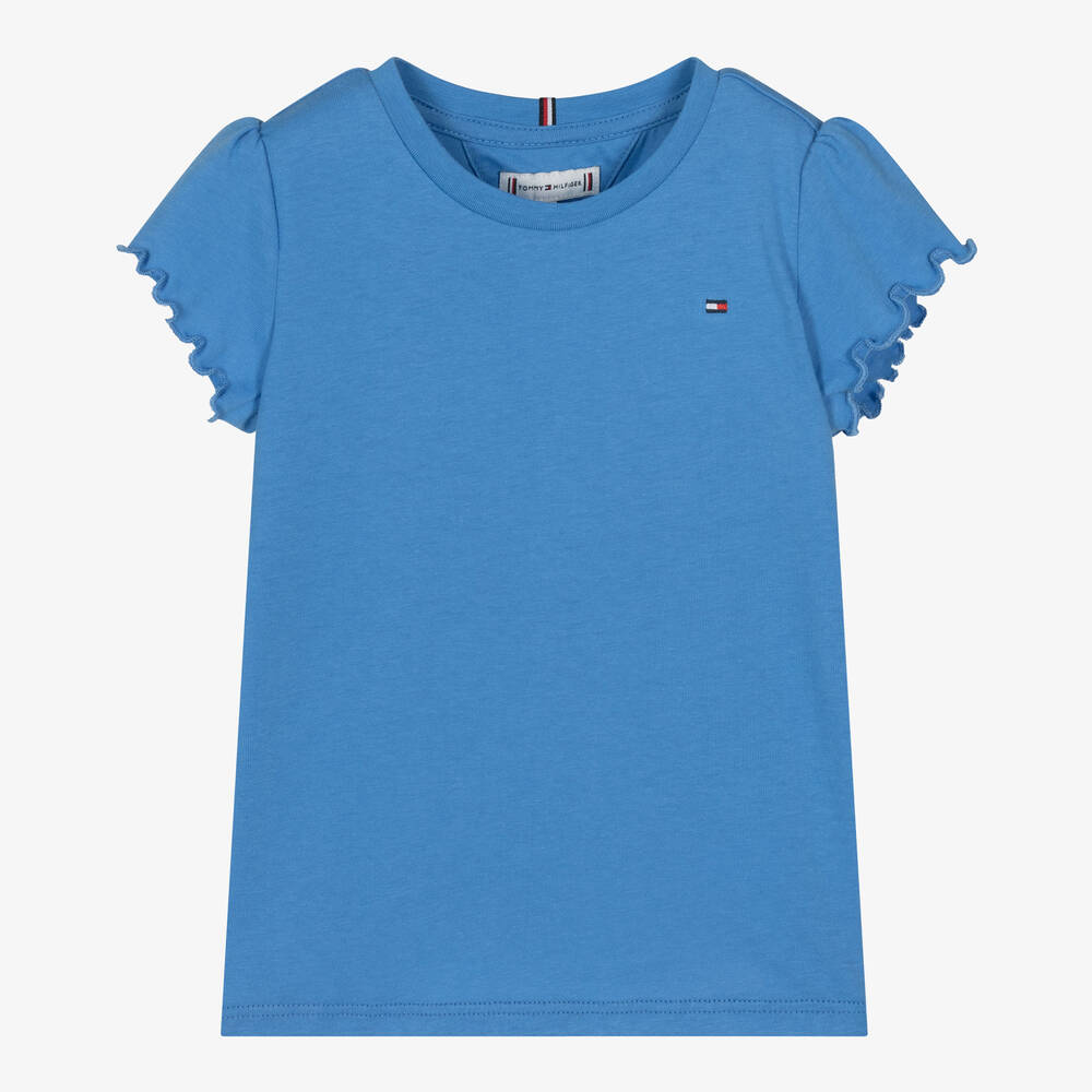 Ideal for updating wardrobe essentials, this blue cotton T-shirt for girls is by Tommy Hilfiger. Made in soft, comfortable jersey, it has pretty puffed sleeves with curly trims. It is detailed with the brand's signature embroidered flag logo and tricolour striped trim for instant brand recognition.