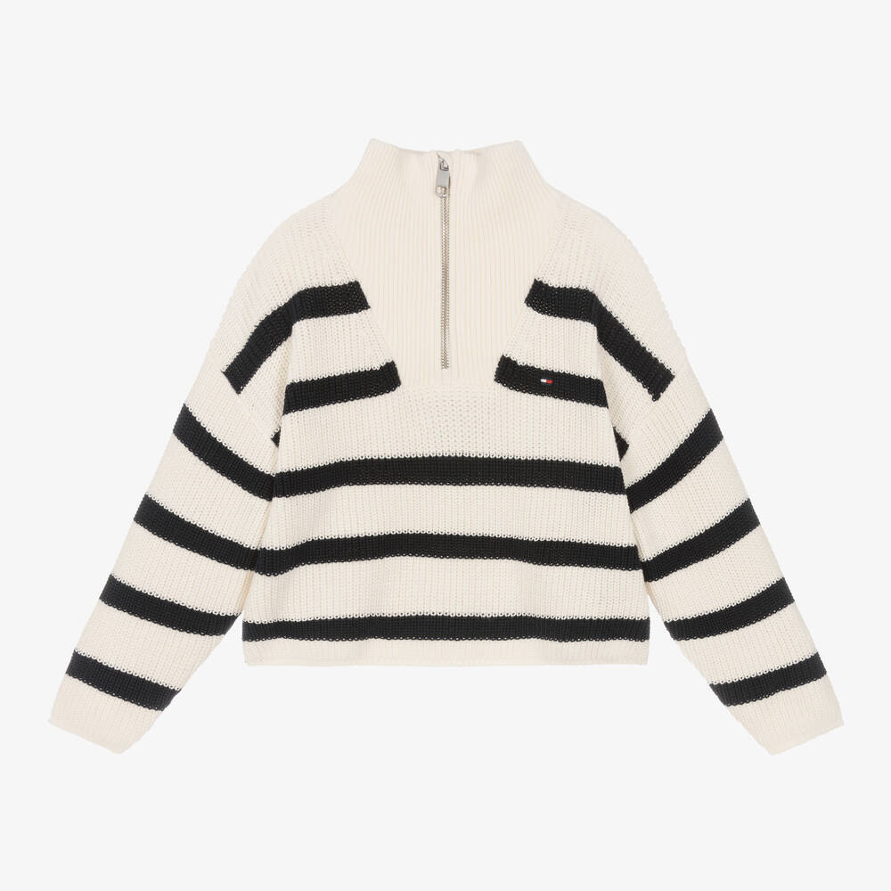 Navy blue and ivory striped sweater for girls by Tommy Hilfiger, made in a soft cotton knit. With long sleeves and a boxy fit, this casual sweater is ideal for layering. It has a high neck with a half zip fastening and the brand's signature flag logo is embroidered on the chest for a discreet designer finish.