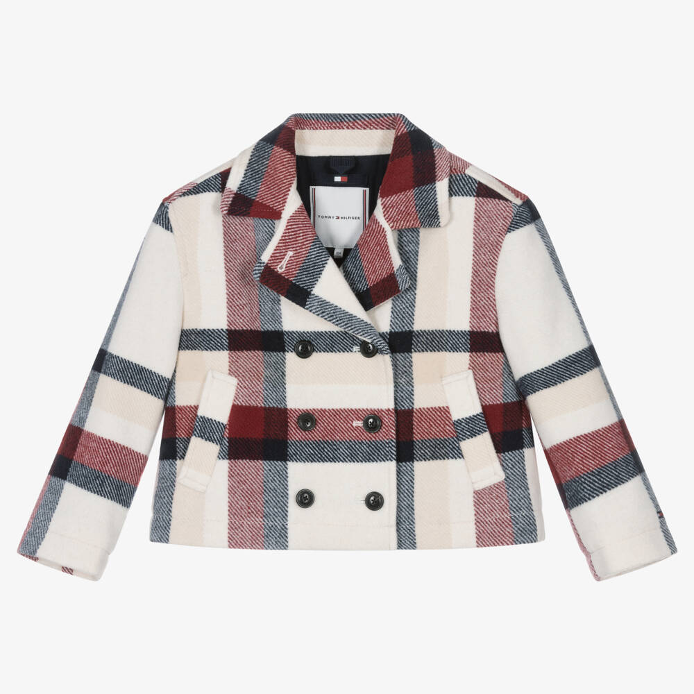Beautifully cosy and stylish, this peacoat for girls is from American brand, Tommy Hilfiger. For a distinctive designer look, it reimagines the designer's blue, red and white Global Stripe motif in a lovely check pattern. Made in a warm wool blend, this double-breasted style has notched lapels, useful front pockets and a quilted satin lining. Branded buttons and flag embroidery on one sleeve add a signature designer finish. The outer material is made with at least 50% recycled polyester and the filling is made with at least 95% recycled polyester.