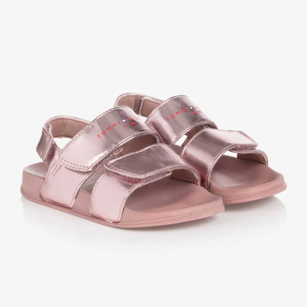Metallic pink sandals for girls by American brand Tommy Hilfiger. Made from lightweight rubber with faux leather straps for durability, these eye-catching sandals are comfortable to wear. They have three adjustable velcro straps for a secure fit. The brand's logo incorporating the iconic flag logo is printed on the front strap for a subtle designer finish.