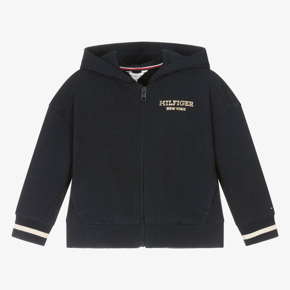 A navy blue long-sleeved hoodie for girls by Tommy Hilfiger, made from soft cotton jersey. Cool and casual, this zip-up top has useful pockets and ivory stripes on the ribbed cuffs. For a signature look, there is a large gold foil logo on the back with matching details on the chest, and an embroidered flag logo on one sleeve.