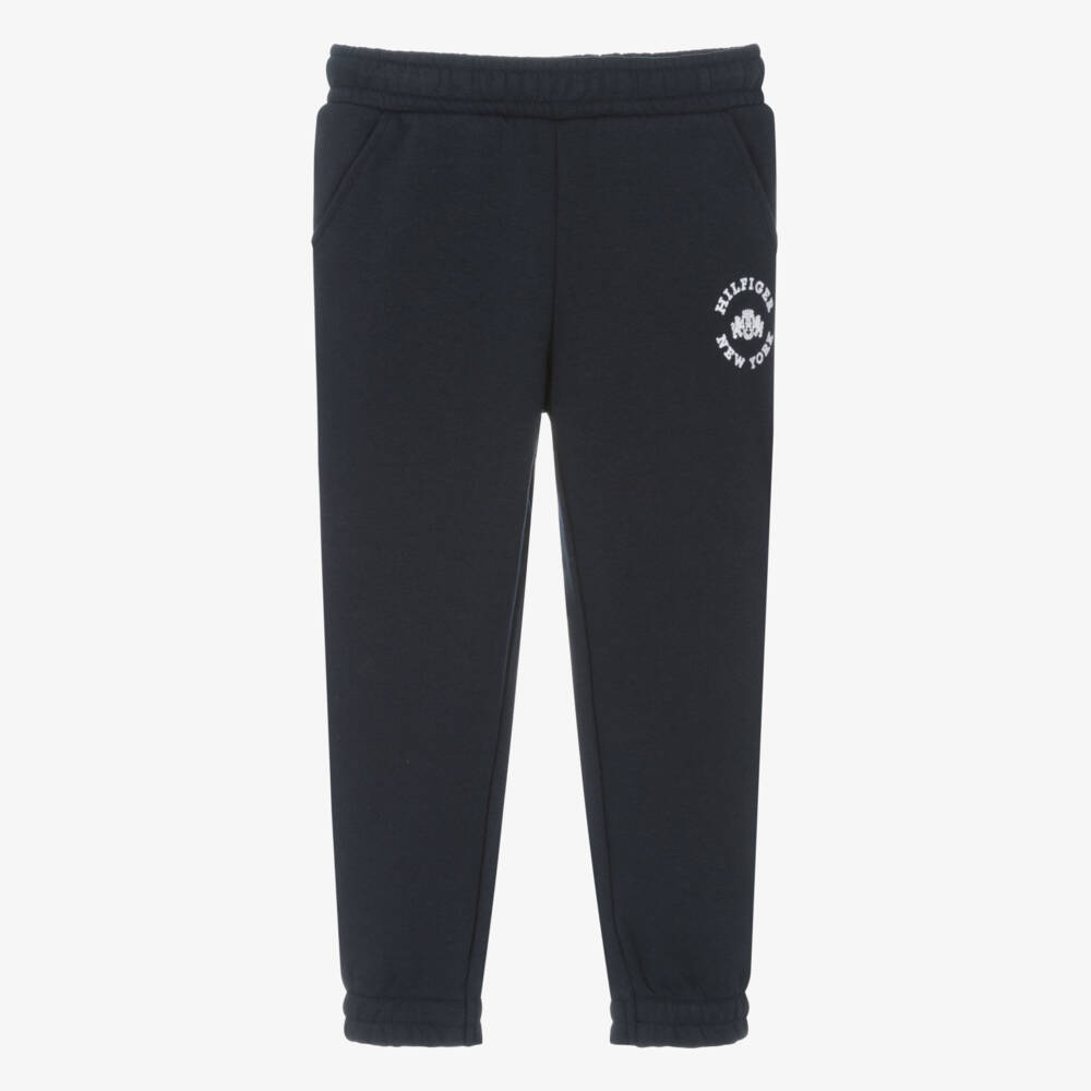 Navy blue joggers for girls by Tommy Hilfiger, made in a soft cotton blend with a fleecy inside. Great for casual days, these comfortable bottoms have a flocked crest logo on one leg and a flag motif embroidered on the back. Styled with slanted pockets on the hips, they have an inner drawstring to easily adjust the fit and elasticated cuffs for an athletic look.