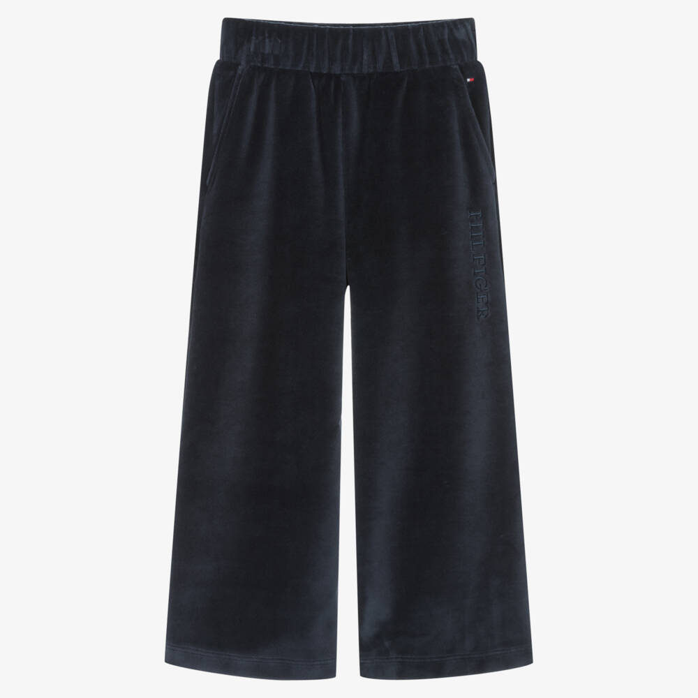 Navy blue cotton-blend joggers for girls by American brand Tommy Hilfiger, in a wide-leg style. Made in comfortable, soft velour with a stretchy, elasticated waist, they have useful front pockets and the iconic embroidered flag logo on one side. The designer's logo is subtly embroidered down one leg in navy blue and there is a logo tab around the back.