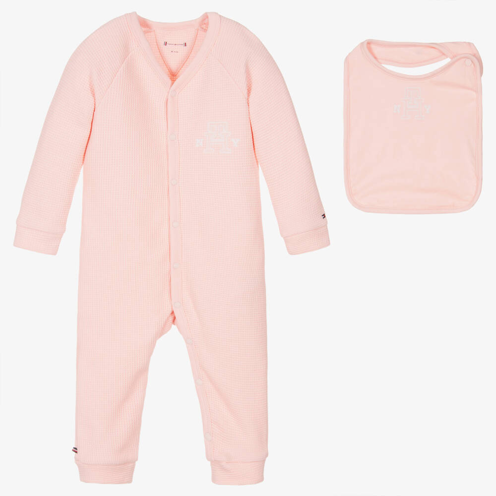 Pale pink cotton romper for baby girls by American brand Tommy Hilfiger, made in comfortable, waffle-patterned jersey. It has a white logo embroidered on one side and easy-to-use popper fastenings on the front and between the legs. It comes with a coordinating jersey bib that fastens with adjustable poppers on one side of the neck. Both pieces have the designer's iconic flag logo embroidery.