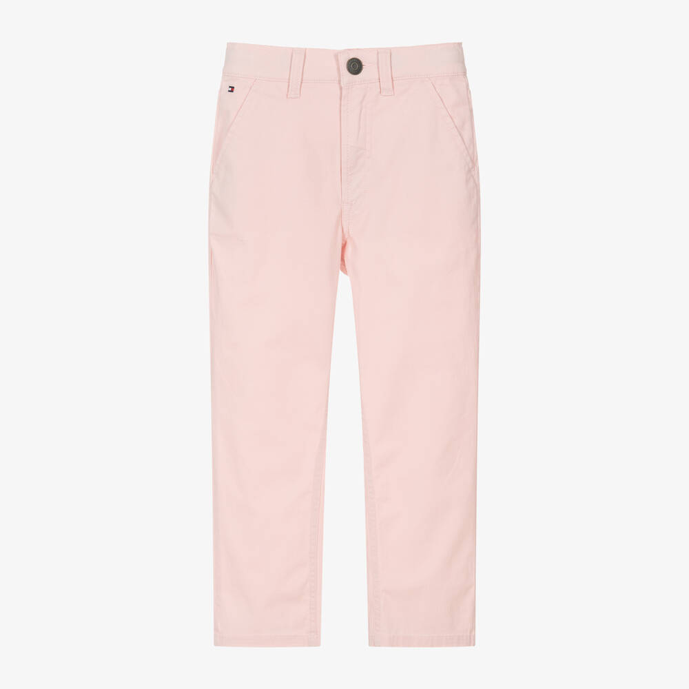Pale pink chino trousers for girls by Tommy Hilfiger, made in soft cotton twill with a hint of stretch for comfort. Ready for casual occasions, they have slanted pockets on the front and handy belt loops on the adjustable waistband. A flag logo is embroidered on the front and further branding can be seen on the back pocket. These wide-leg trousers have a button and zip fastening and are made with at least 95% organic cotton.