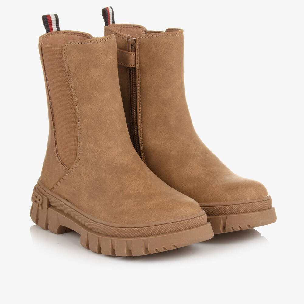 From Tommy Hilfiger, a pair of tan brown Chelsea boots for girls, made in smooth and supple faux suede leather. This classic style has embossed logo lettering on the heel and a pull tab on the back in the brand's signature colours. There is an elasticated insert on one side and a zip fastening on the other to help get them on and off. They have a soft textile lining, a lightly cushioned insole and a chunky, non-slip rubber sole. This item is made with at least 50% recycled materials.