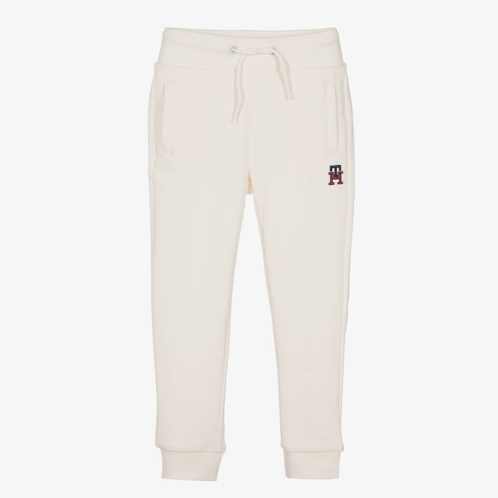 Comfortable for boys and girls, these ivory joggers are from American brand, Tommy Hilfiger. Made in soft cotton sweatshirt jersey, they have an elasticated waistband with a drawstring fastening for an adjustable fit and three useful pockets. For a subtle designer finish, they have an embroidered monogram logo on the front and the signature flag logo on the back.