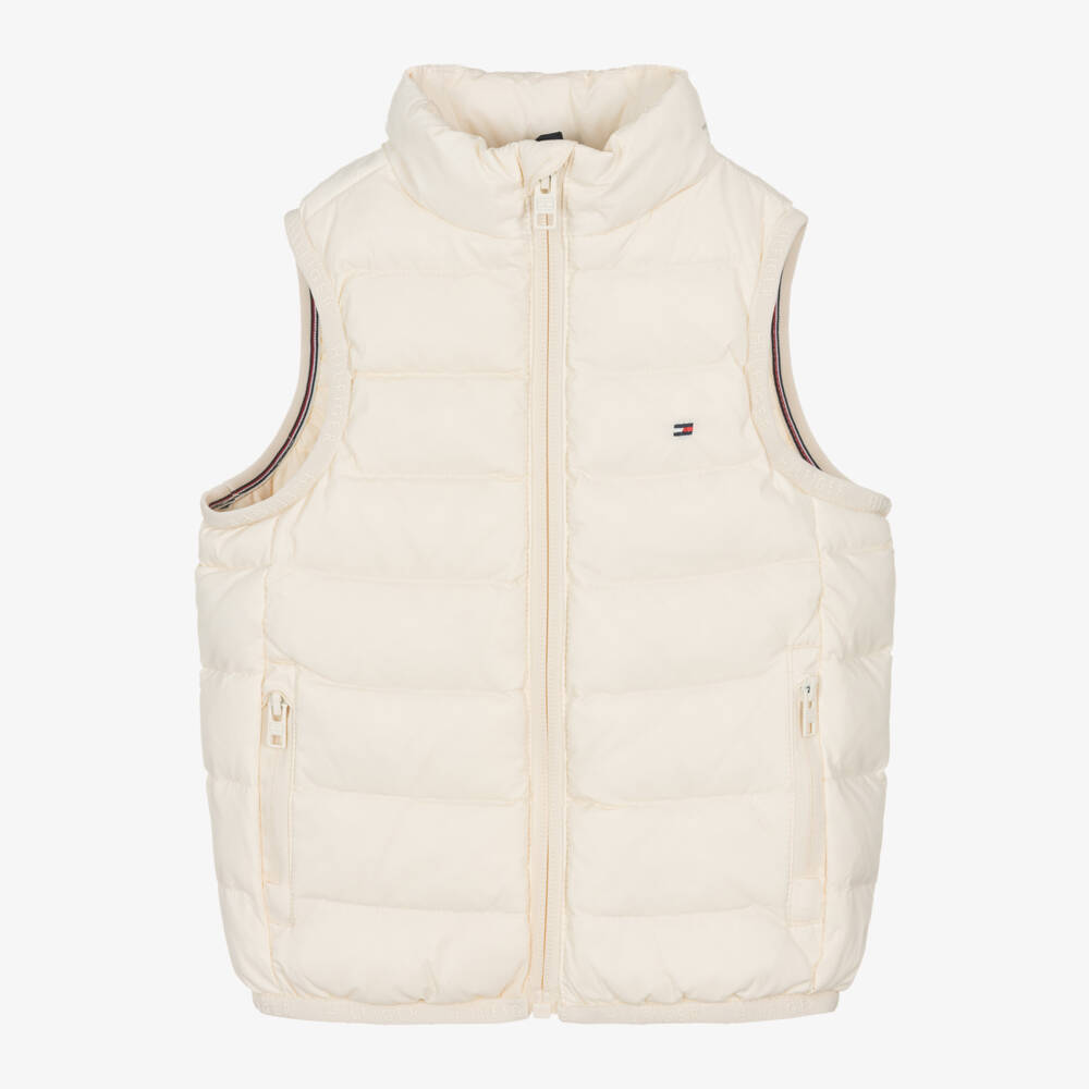 An ivory gilet for boys and girls by Tommy Hilfiger. Soft and smooth, this warm down-padded gilet is lightweight and great for layering in the colder months. Fully lined, it has fleece-lined zipped pockets for extra comfort and a front zip fastening with a protective chin guard. There is a branded trim on the armholes and hem, a printed logo on the back of the neckline, and an embroidered flag logo on the chest for a distinctive finish. The outer material of this product is made from at least 95% recycled nylon.