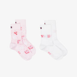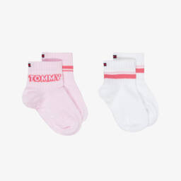 Two pairs of Tommy Hilfiger socks for baby girls, in ivory with signature flag logos. Made in a beautifully soft and comfortable cotton-rich blend, one pair is plain, one has colourful pastel stripes, and both have rubberised star prints on the soles.
