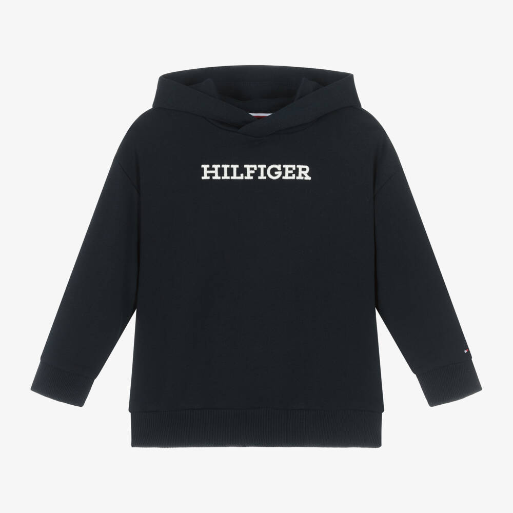 Navy blue long-sleeved hoodie for boys and girls by Tommy Hilfiger, made in soft, mid-weight cotton jersey, with cosy ribbed trims. Creating instant designer appeal, this casual top has a white monotype logo embroidered on the front and the brand's signature small flag logo embroidered on one sleeve.