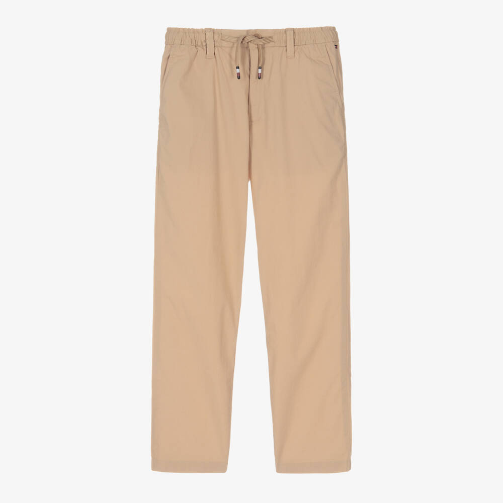 These beige straight-leg trousers for teen boys are designed by American label Tommy Hilfiger. Super comfortable, they are woven in lightweight cotton with added stretch. Utility-style patch pockets and a branded drawstring waist offer a cool contemporary update to these classic chino trousers. The designer's retro logo label is stitched on one back pocket and the iconic flag is embroidered on the front. Fastening with a front button and zip, the waist is elasticated for a good fit. These bottoms are made with at least 50% organic cotton.