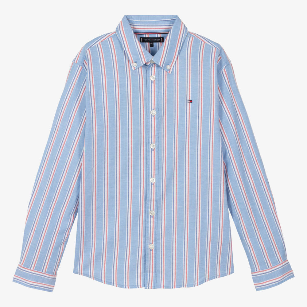 A long-sleeved shirt for teen boys from Tommy Hilfiger, woven in the American brand's distinctive blue, white and red Ithaca stripes. For added designer detail, the signature flag logo is embroidered on the chest, with striped trim inside the collar and a striped button on the cuffs. Made in softly woven cotton, it features a stylish button-down collar for a casual yet smart look. This product is made with at least 95% organic cotton.