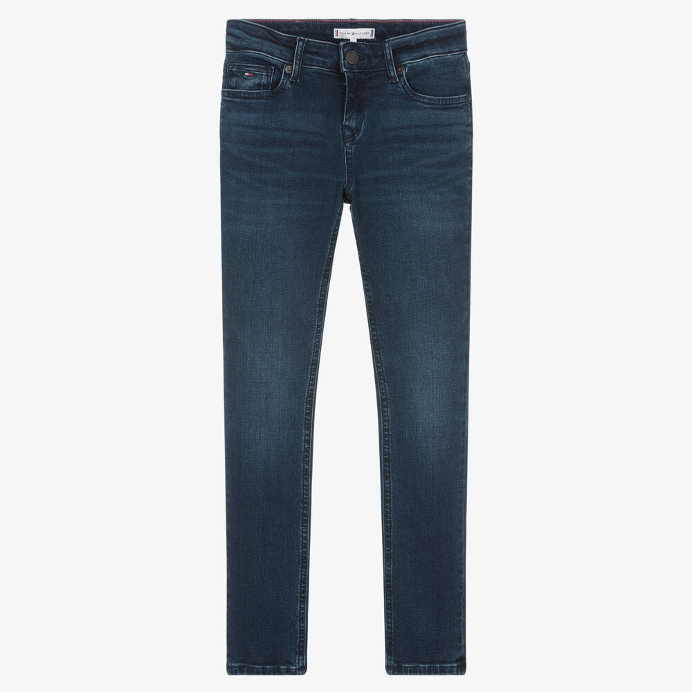 Blue dark wash skinny jeans for teen girls by Tommy Hilfiger, with the designer's iconic flag logos embroidered on both the coin pocket and back pocket. Made in soft cotton denim with a slight stretch for comfort, they have classic five-pocket styling. There are branded metal rivets and a logo jacron on the back for a signature look. They fasten with a zip and a logo-branded button and have an adjustable waist for a comfortable fit. This product is made with at least 20% recycled cotton.
